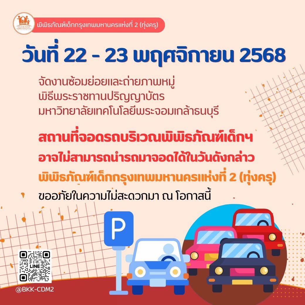 ประกาศเเจ้งเตือน วันที่ 22 - 23 พฤศจิกายน 2568สถานที่จอดรถบริเวณพิพิธภัณฑ์เด็กกรุงเทพมหานครเเห่งที่ 2 (ทุ่งครุ) อาจไม่สามารถนำรถมาจอดได้ในวันดังกล่าว