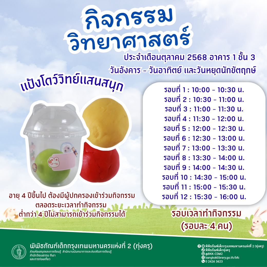 กิจกรรม “แป้งโดว์วิทย์แสนสนุก” เป็นกิจกรรมที่ช่วยให้เด็ก ๆ ได้ฝึกการใช้กล้ามเนื้อมัดเล็ก และเรียนรู้เรื่องพอลิเมอร์ผ่านการทดลองทำแป้งโดว์จากวัตถุดิบภายในบ้าน นอกจากจะสร้างความสนุกสนานแล้วยังเป็นการใช้เวลาว่างให้เกิดประโยชน์ รวมไปถึงกระตุ้นการทำงานของประสาทสัมผัสต่าง ๆ ให้ประสานกันได้อย่างมีประสิทธิภาพอีกด้วย