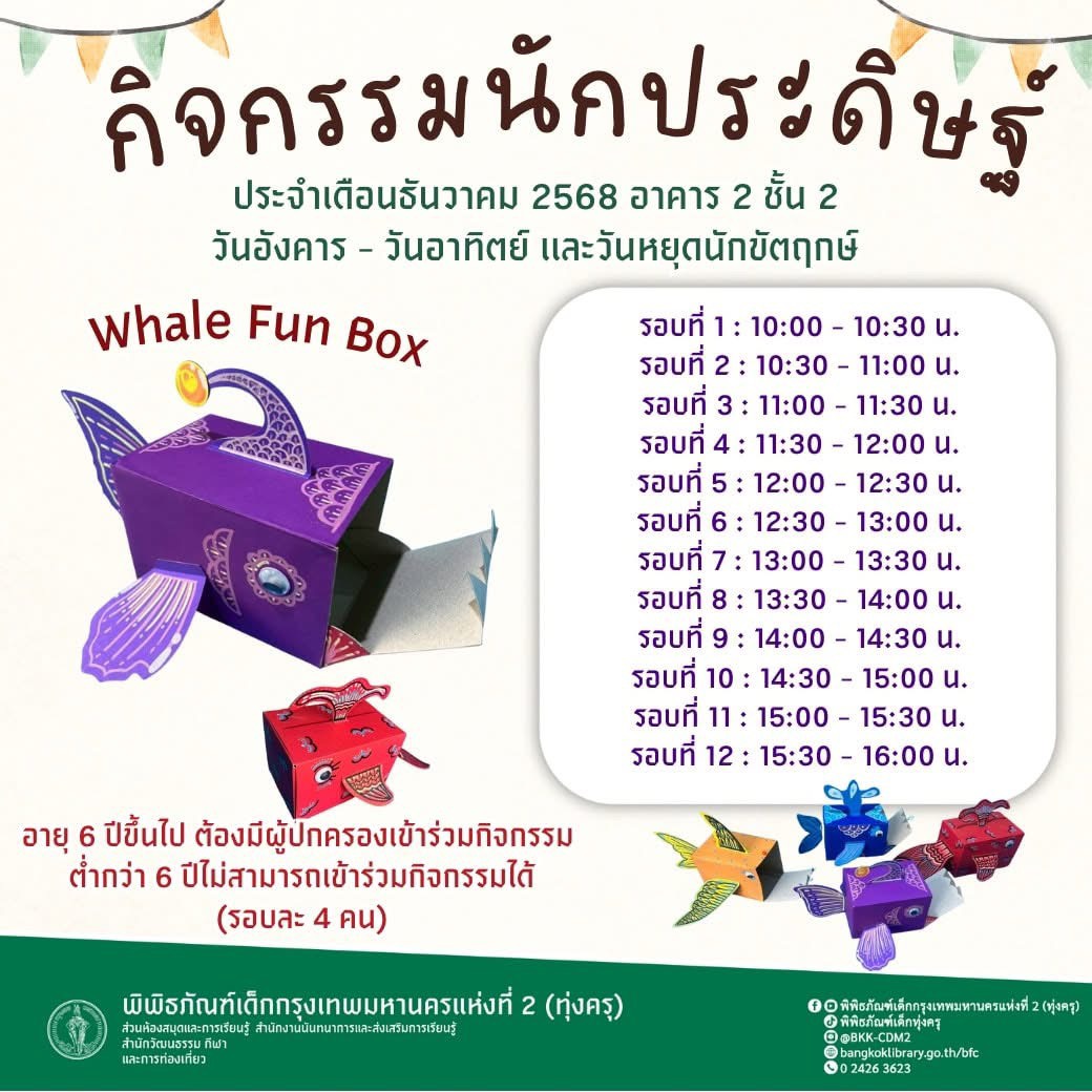 กิจกรรม Whale Fun Box เป็นกิจกรรมที่ช่วยให้ผู้เข้าร่วมได้เรียนรู้เกี่ยวกับผลกระทบของการใช้กระดาษซึ่งเป็นหนึ่งในขยะที่มีปริมาณมากในปัจจุบัน พร้อมทั้งปลูกจิตสำนึกเรื่องความรับผิดชอบต่อสิ่งแวดล้อม และสังคมไปพร้อมกัน นอกจากนี้ ผู้เข้าร่วมยังได้ฝึกพัฒนากล้ามเนื้อมัดเล็ก รวมถึงการใช้ประสาทสัมผัสต่าง ๆ ให้ทำงานประสานกันอย่างมีประสิทธิภาพอีกด้วย