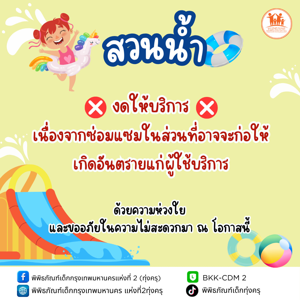 สวนน้ำ งดให้บริการ เนื่องจากซ่อมแซมในส่วนที่อาจจะก่อให้เกิดอันตรายแก่ผู้ใช้บริการ . ด้วยความห่วงใย และขออภัยในความไม่สะดวกมา ณ โอกาสนี้
