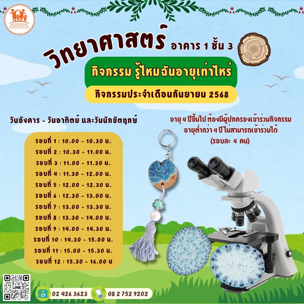กิจกรรม รู้ไหมฉันอายุเท่าไร เป็นกิจกรรมเรียนรู้เรื่องวงปีของต้นไม้ยืนต้น โดยจะศึกษาว่าวงปีเกิดขึ้นได้อย่างไร และสามารถคาดเดาสภาพอากาศในอดีต และอายุของไม้ต้นนั้นได้ เส้นวงปีของต้นไม้ เกิดจากการเจริญของเนื้อเยื่อด้านข้าง เพื่อสร้างท่อลำเลียงขึ้นมาใหม่ โดยมักจะพบในพืช ใบเลี้ยงคู่ ถ้าปีใดฝนตกชุกมีปริมาณน้ำฝนมาก เส้นวงปีจะกว้างเป็นสีน้ำตาลอ่อน ปีไหนแล้งปริมาณน้ำฝนน้อยเส้นวงปีจะแคบและมีสีน้ำตาลเข้ม วงปีจึงใช้บอกอายุต้นไม้ ปริมาณน้ำฝน สภาพอากาศในแต่ละรอบปี นอกจากนี้ ช่วยบ่งบอกถึงสภาพสิ่งแวดล้อมต่าง ๆ ในอดีต ในพื้นที่ที่ต้นไม้นั้นเจริญเติบโตได้อีกด้วย