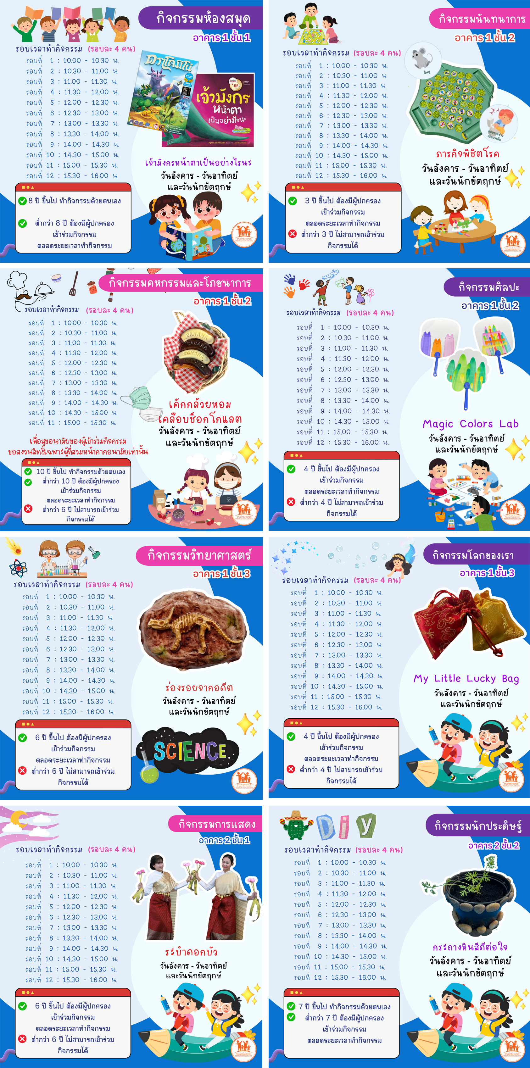 ขอเชิญน้อง ๆ หนู ๆ มาร่วมสนุกในกิจกรรมประจำเดือนพฤศจิกายน กิจกรรมที่ช่วยเสริมสร้างจินตนาการ การเรียนรู้ต่าง ๆ และความสนุกสนานที่เตรียมไว้ให้น้อง ๆ ถึง 8 โซนกิจกรรมด้วยกัน