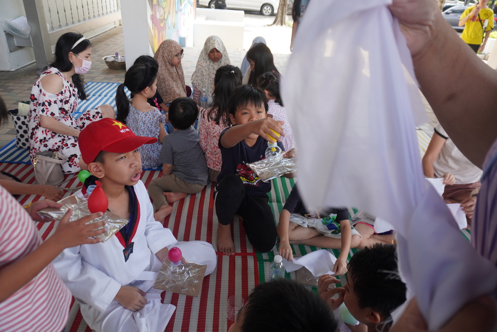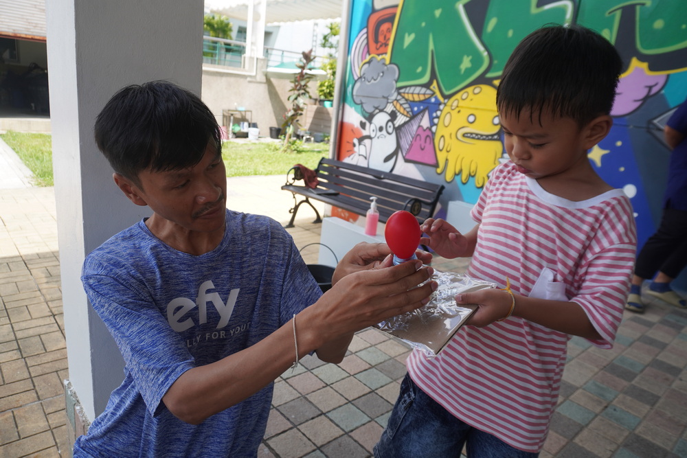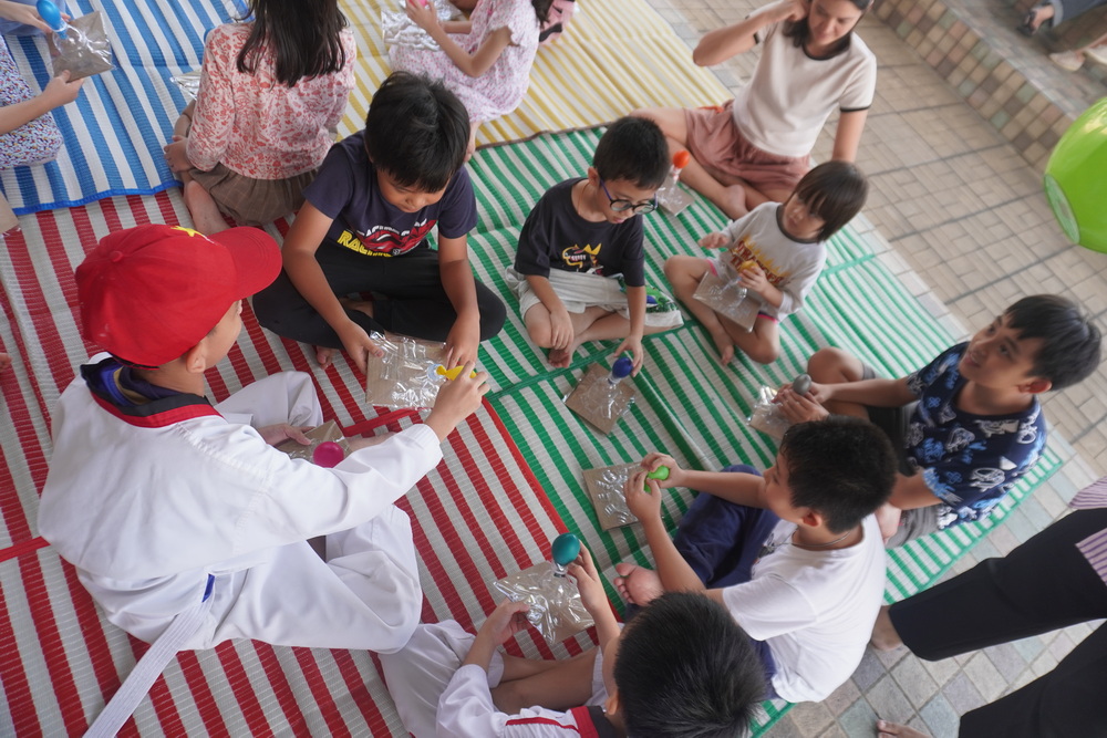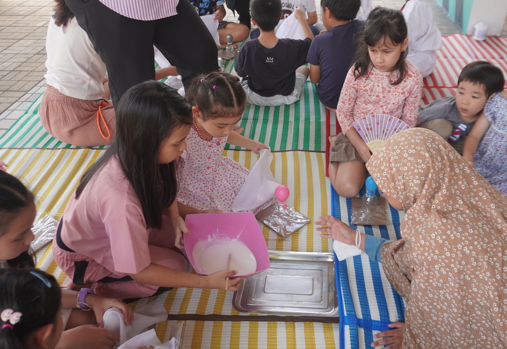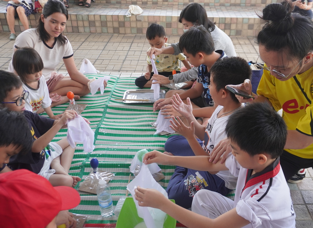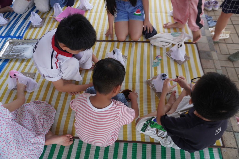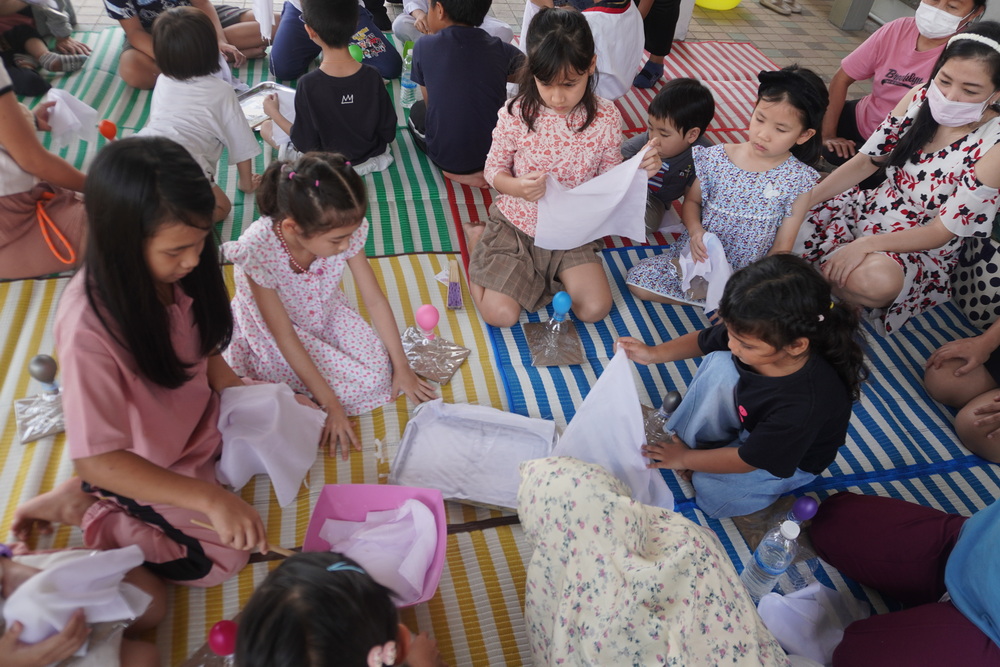 น้องๆ ได้ลงมือผสมน้ำและกาว นำผ้าไปชุบและบิดหมาด พร้อมกับสร้างผีสุดน่ารักของตัวเองขึ้นมา